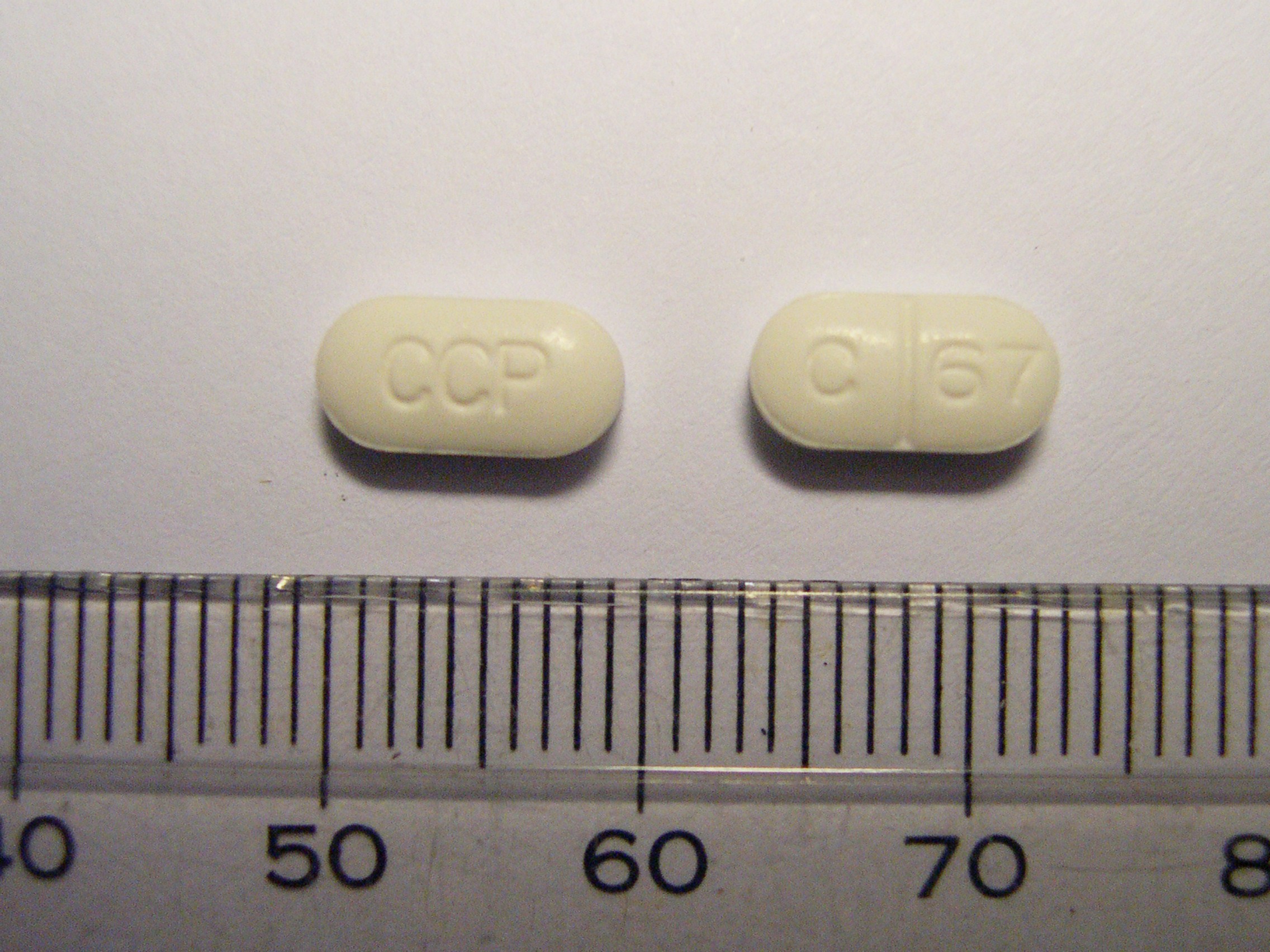 白色橢圓形錠,有CCP及C 67字樣